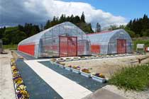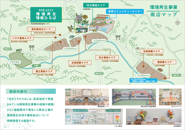 「ながどろひろば」は長泥地区で実施されている環境再生事業の経緯や概要、さらに福島県内で発生した除去土壌の復興再生利用や最終処分について情報発信する施設です。ながどろひろば北側にある理解醸成のためのビニールハウスも見学可能です。
