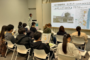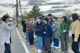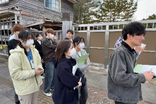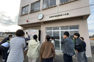 次に、双葉町を訪れ、休校になっている双葉高校から旧商店街や双葉駅前周辺を歩くフィールドワークを行いました。町が移住に力を入れ移住者が増えるなか、義務教育を終えた子供たちが通う高校が双葉郡北部にはない現状を知り、驚きました。震災当時のまま残る住宅、建物が解体され更地になった場所、新築住宅などが混在する双葉町の今を目の当たりにして震災からの課題への理解を深めました。
