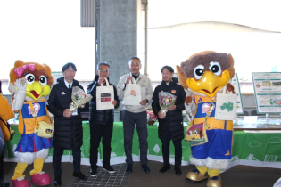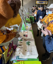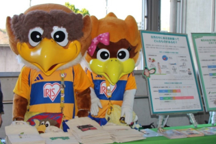 ブースでは福島県内の除染で生じた土の復興再生利用と県外最終処分を紹介するパネル、飯舘村長泥地区の実証事業で栽培された花のフラワーアレンジメントなどを展示し、パネルと連動したスマートフォンを使ったクイズの参加者に、押し花のしおりや郡山女子大短期大学部の学生が環境再生をテーマにデザインしたエコバッグをプレゼントしました。また、ベガルタ仙台のエンブレムにも登場するワシ(アルタイルが属するわし座に由来)をモチーフにしたクラブマスコット、兄「ベガッ太」と妹「ルターナ」も応援にかけつけてくれました。