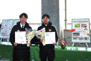 ベガルタ仙台のレジェンドで、クラブコーデネーター梁勇基さんとクラブコミュニケータ富田晋伍さんにもお越しいただき、最終戦にふさわしい素晴らしい試合となるよう願いを込め、長泥地区で栽培されたカーネーションなどの花束を贈呈しました。